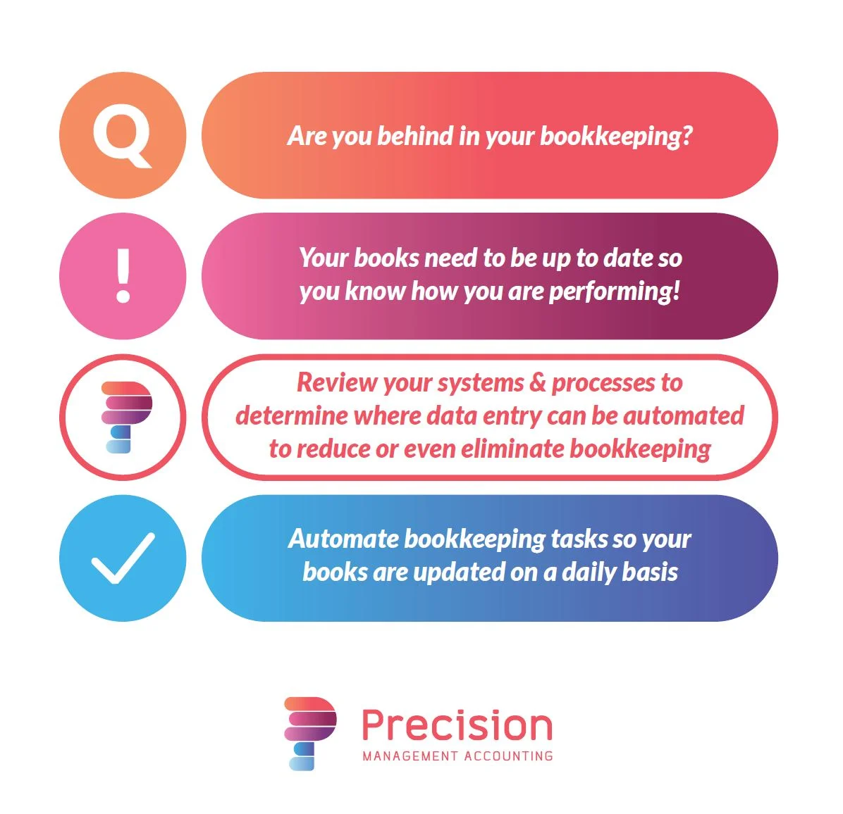 Use technology and functions within your chosen systems to automate bookkeeping tasks to ensure that there is no delay with producing valuable financial information.